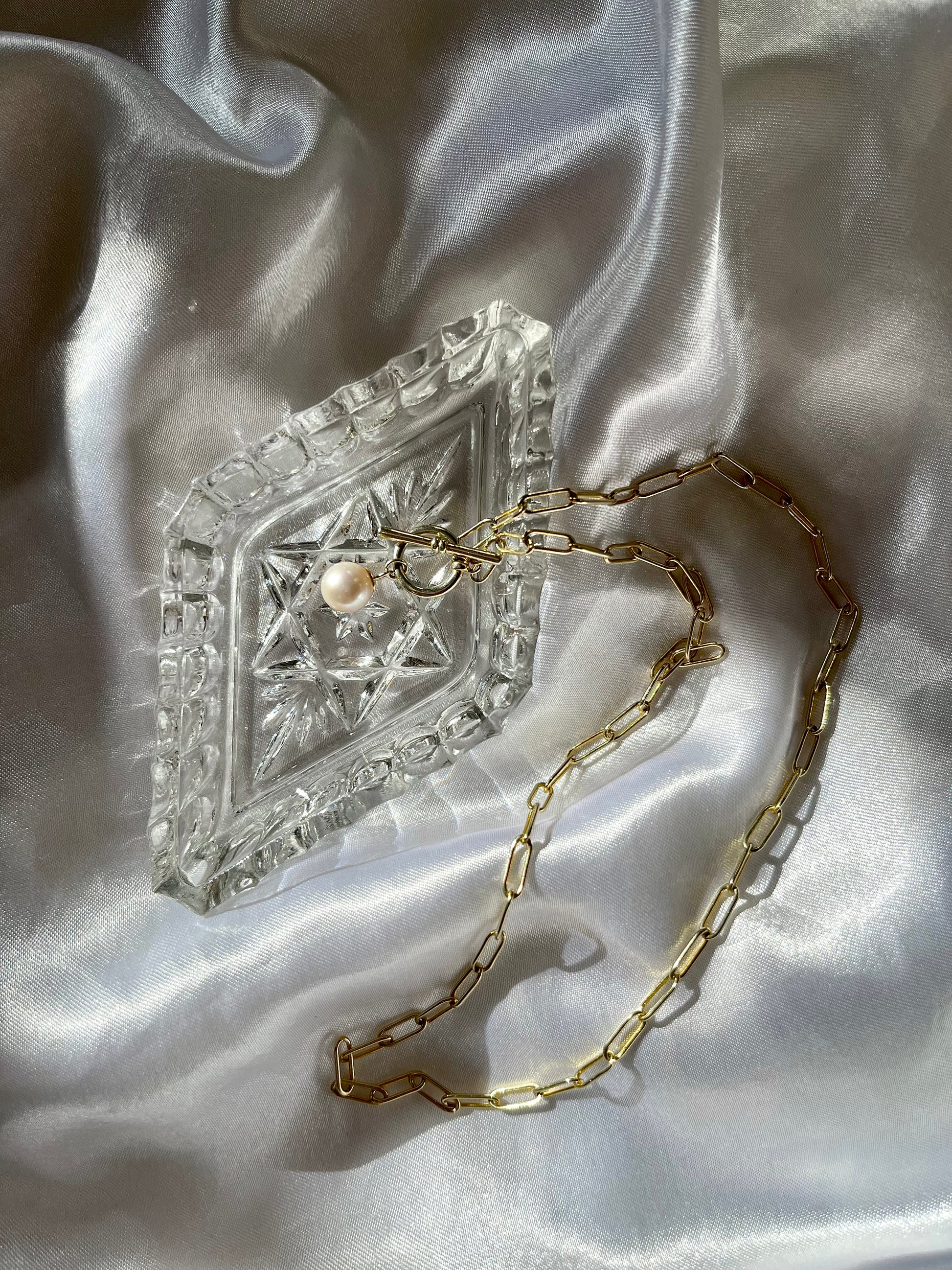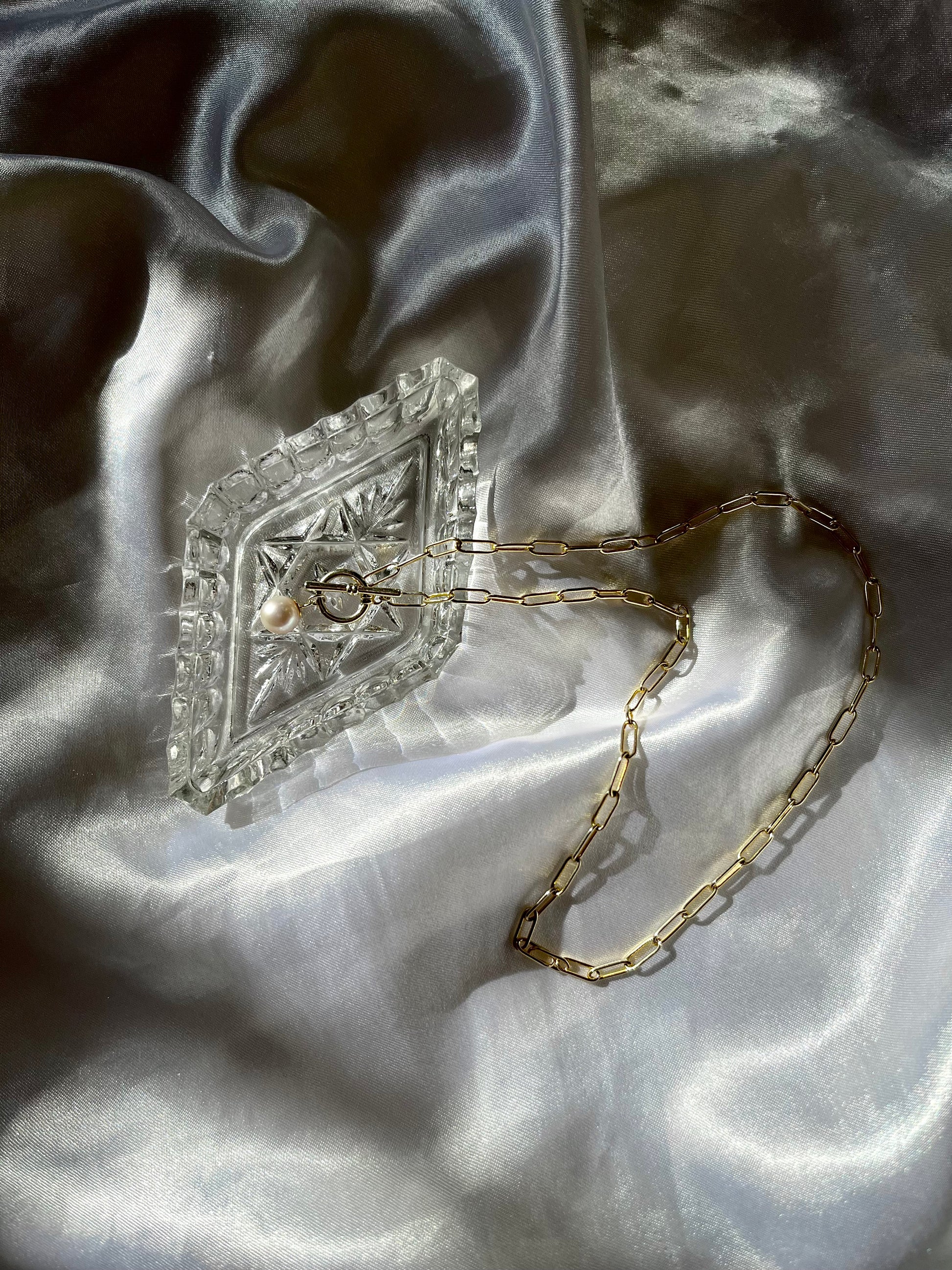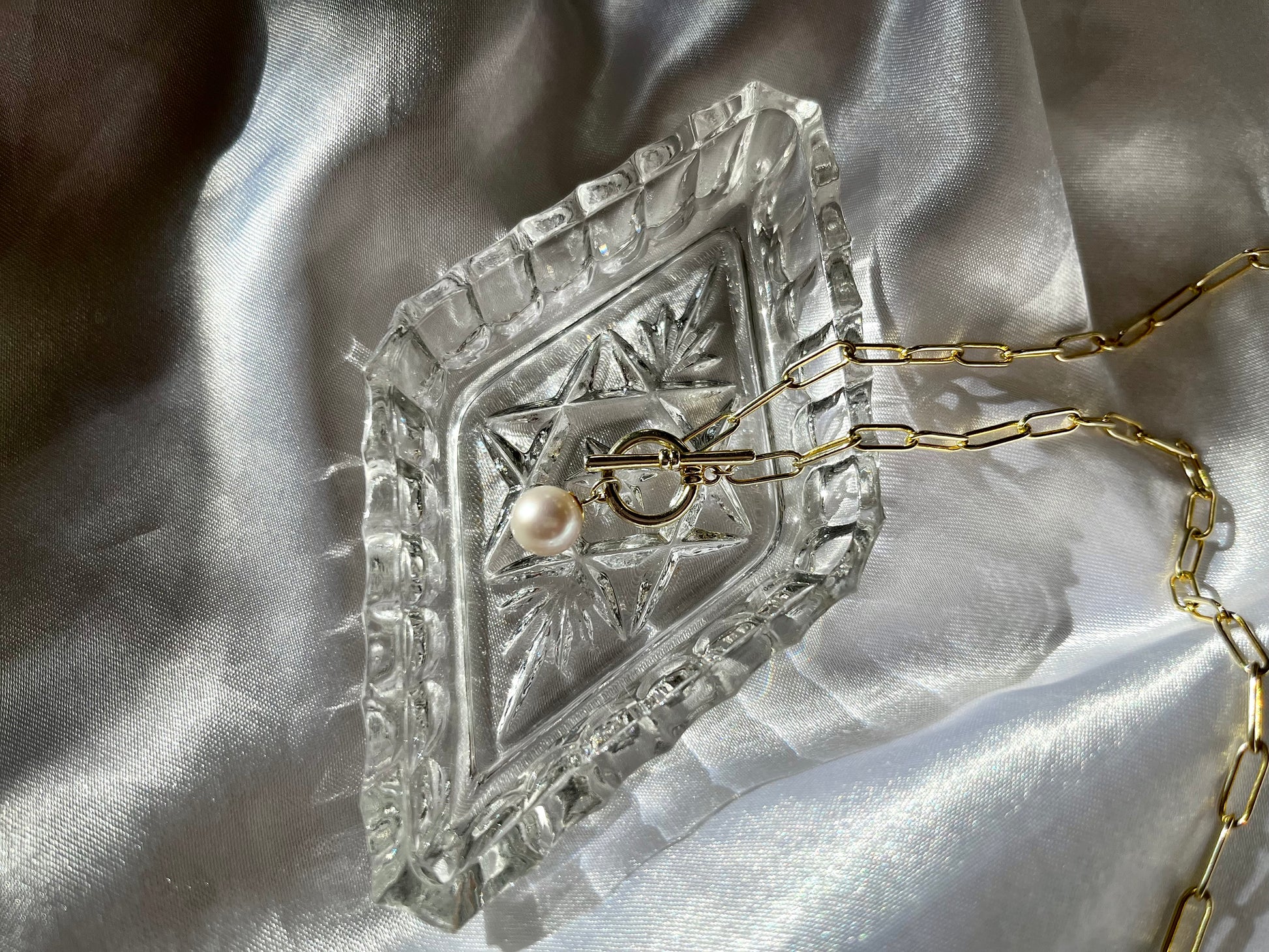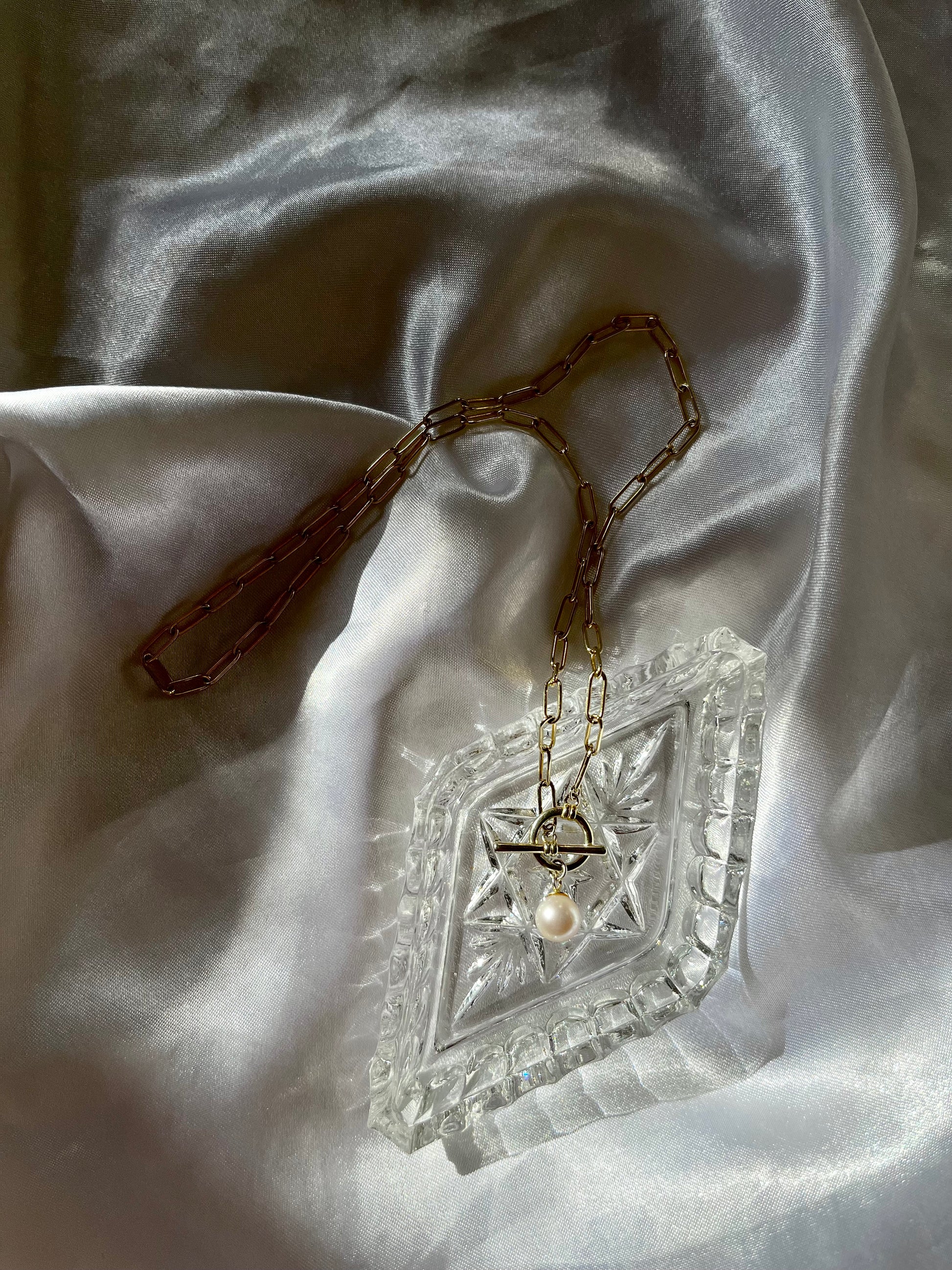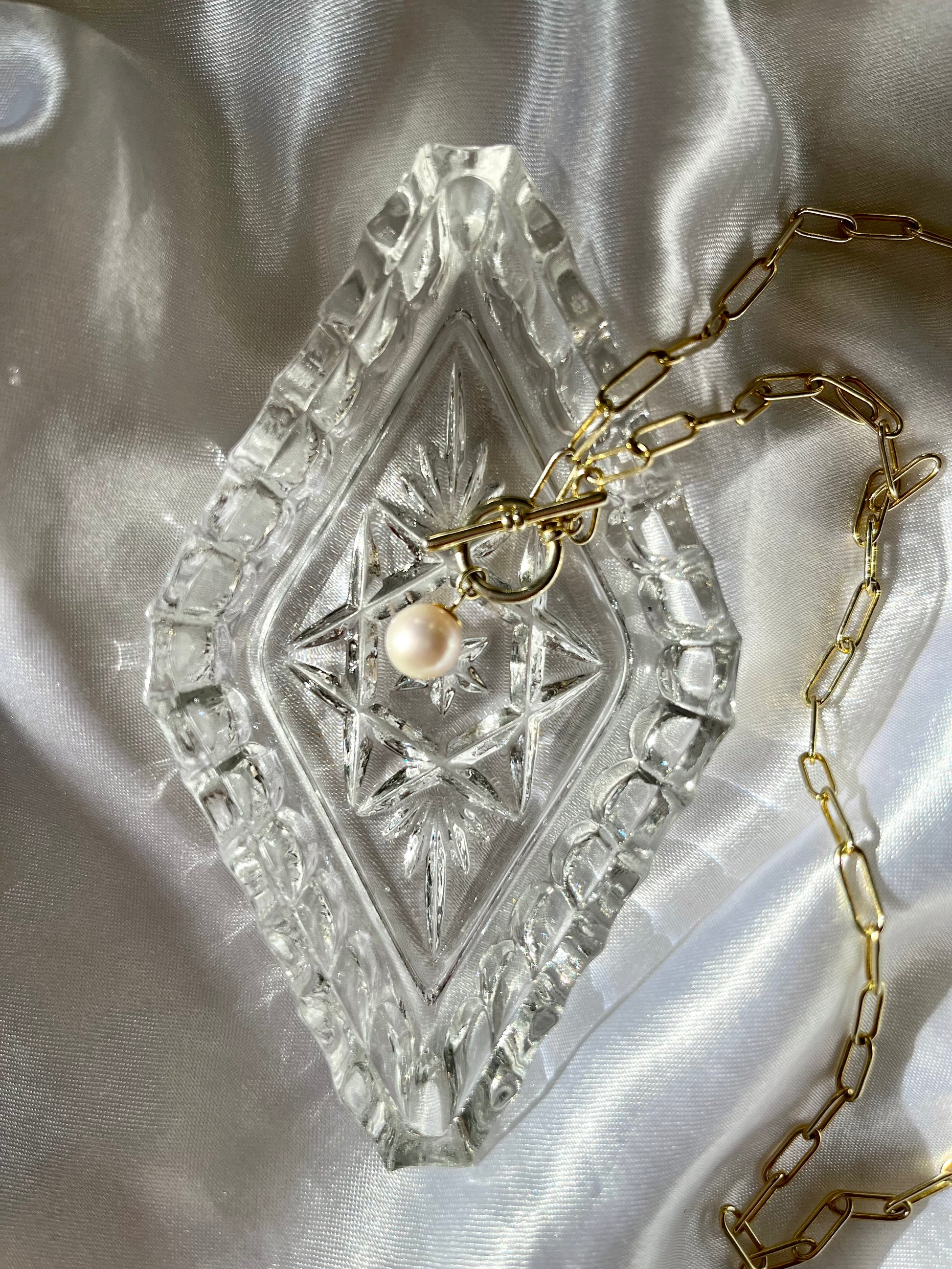 A minimalist gold plated silver toggle chain with a lustrous freshwater pearl pendant. This necklace would be a perfect accessory to go for everyday!