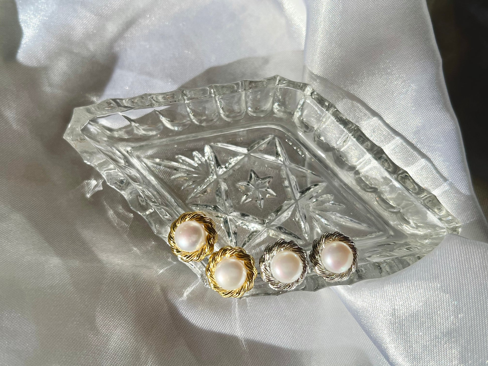 A pair of vintage inspired pearl earrings in a simple and elegant style. Featuring a lustrous button shape freshwater pearl, surrounded by a twist halo.